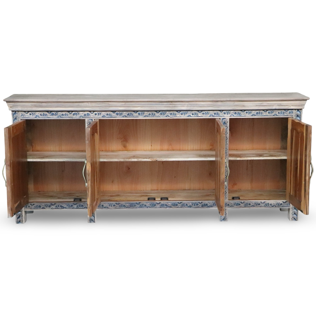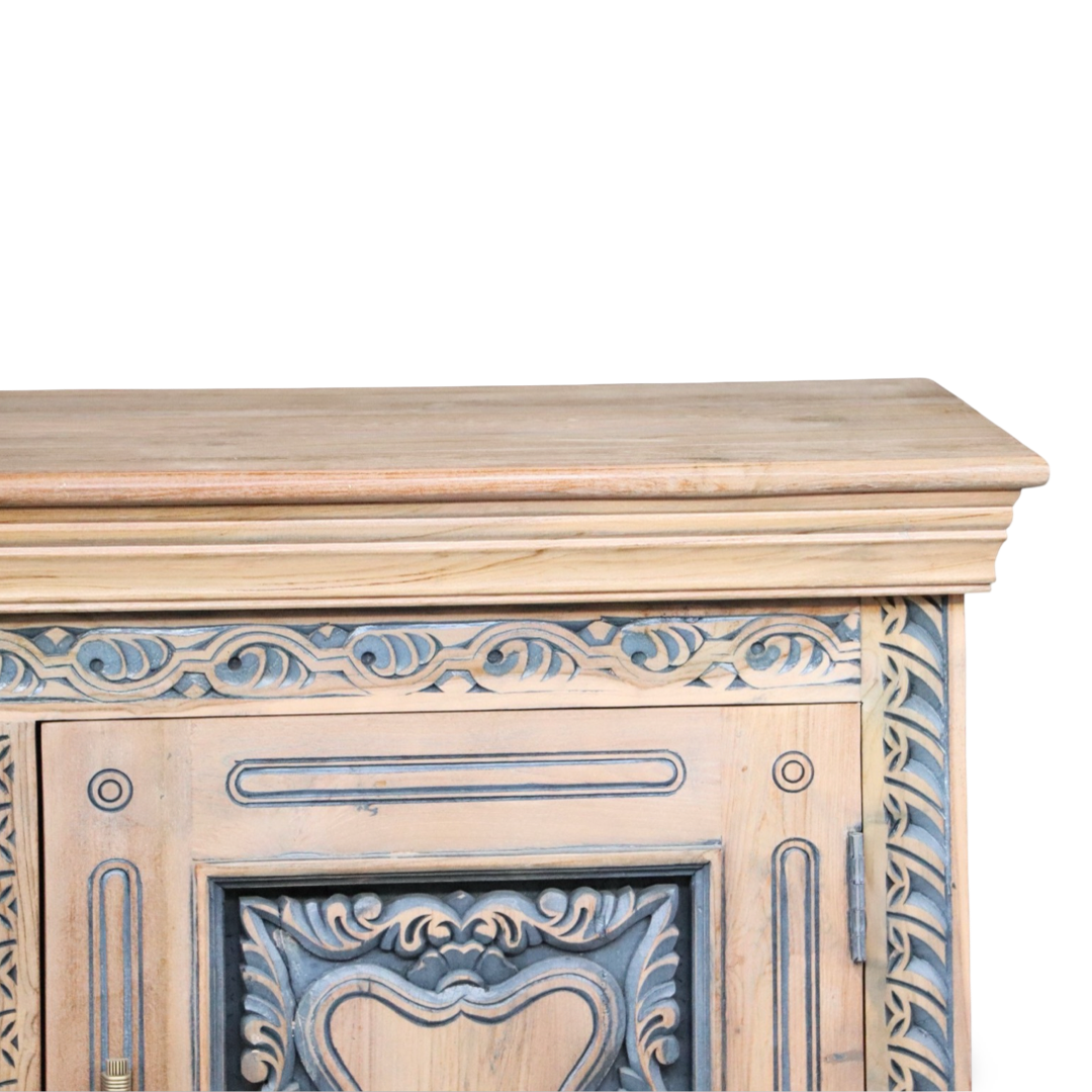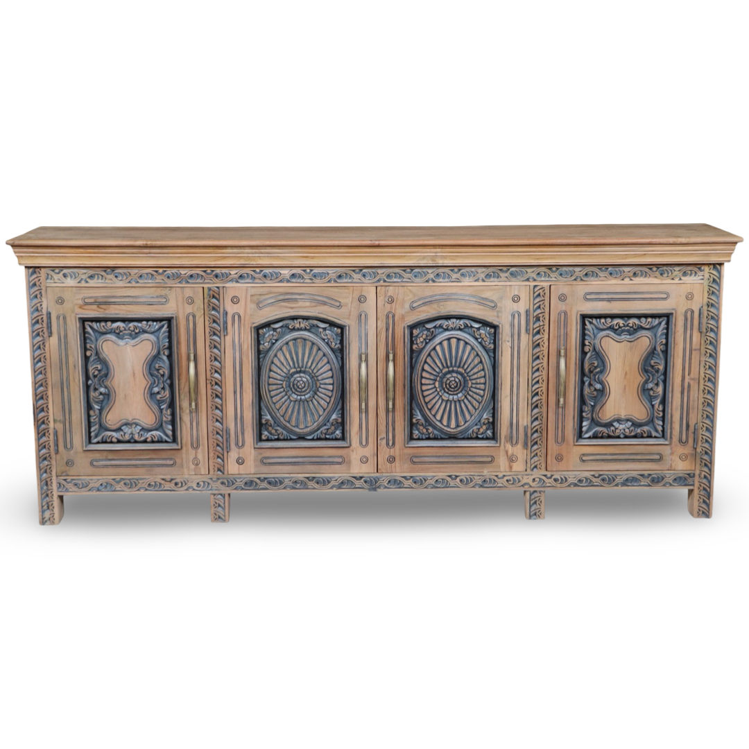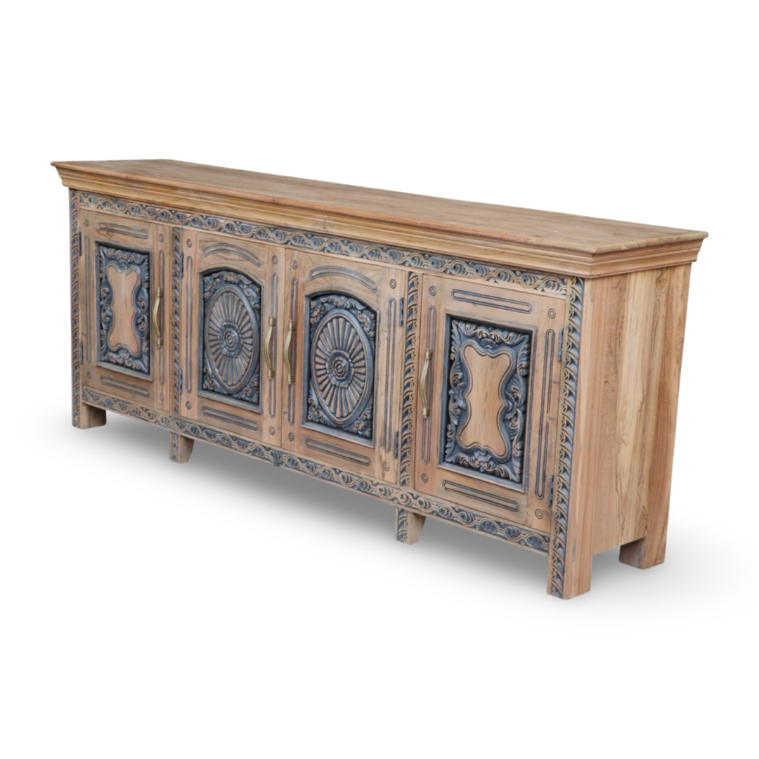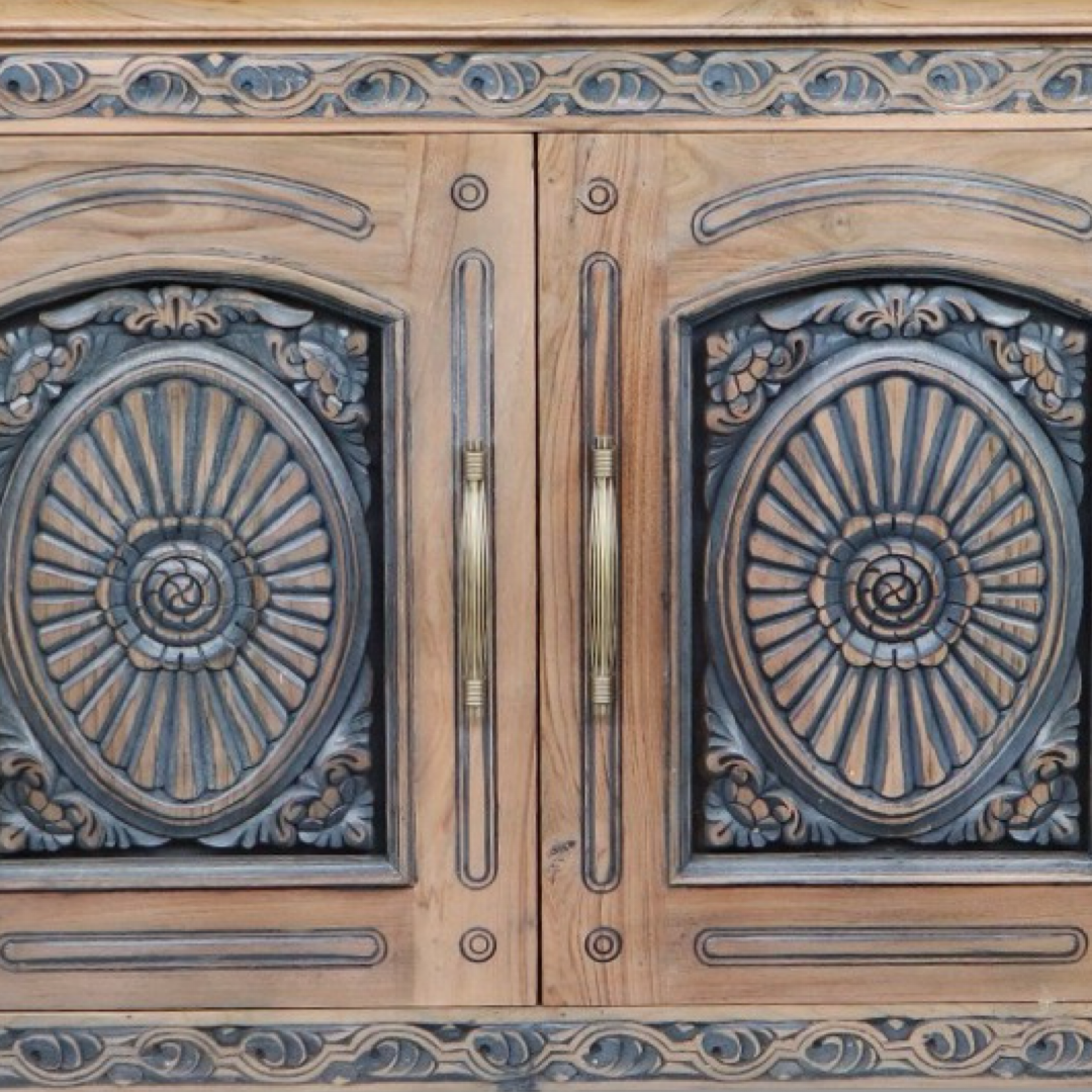 Bifes elaborados a mano en la India, en madera maciza y con tallas artesanales que hacen de cada pieza algo único. Combinan carácter decorativo y funcionalidad, ideales para guardar vajilla, textiles o piezas especiales.