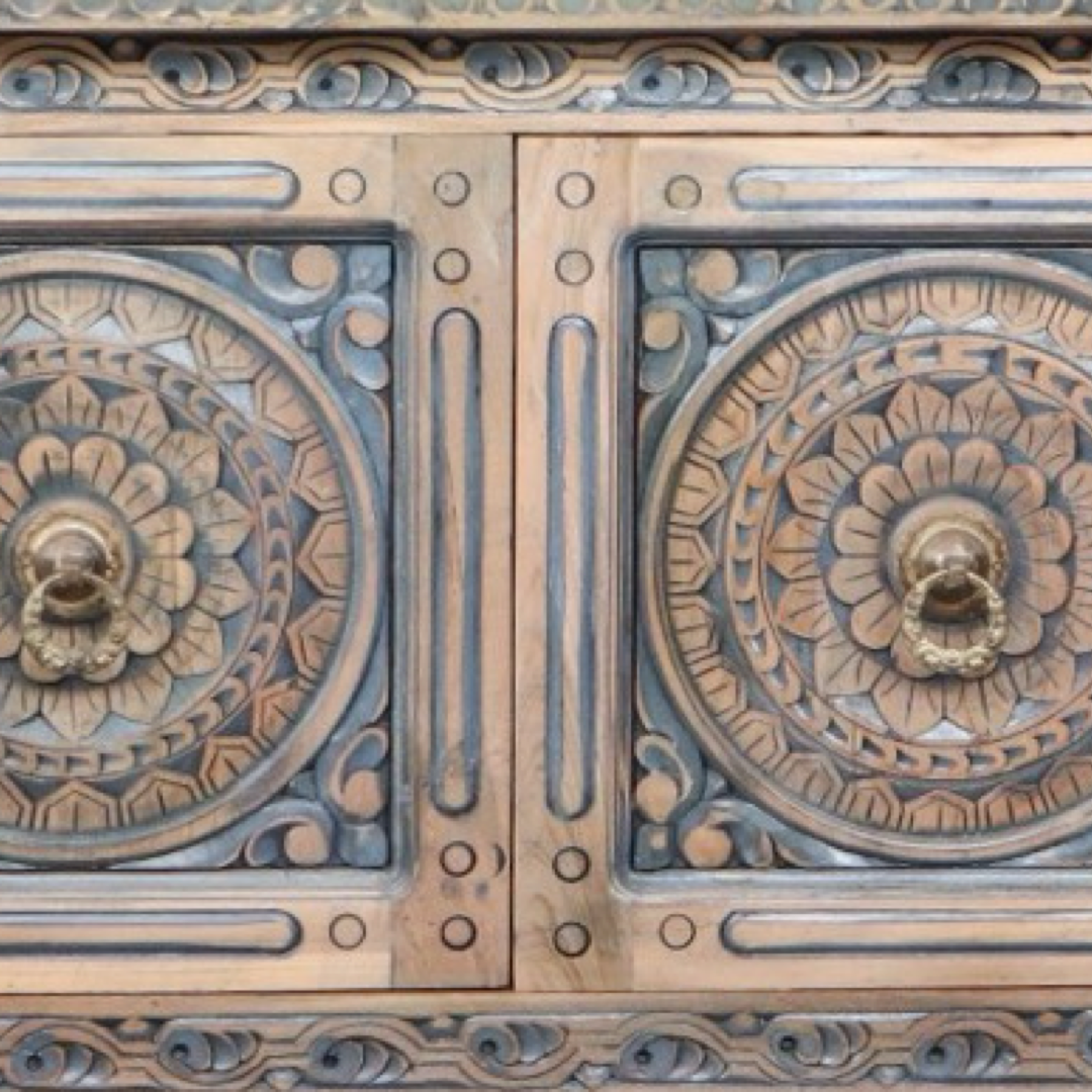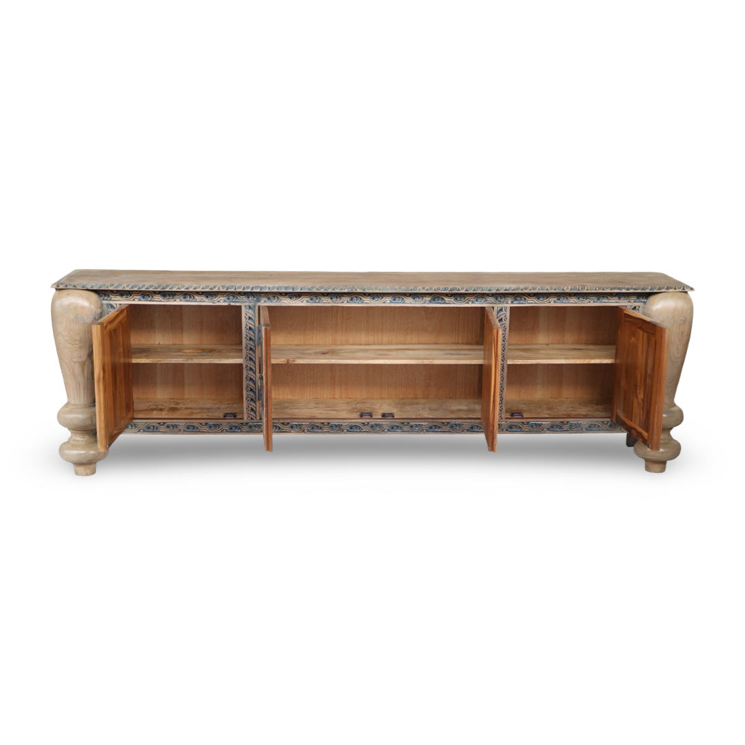 Este stand de TV es una pieza única, elaborada en madera maciza reciclada y tallada a mano por artesanos en la India. Cada mueble conserva el carácter de la madera antigua, con detalles ornamentales que reflejan la tradición y el arte del tallado indio. Más que un soporte funcional, es un elemento decorativo con historia y personalidad, ideal para espacios con alma y estilo.