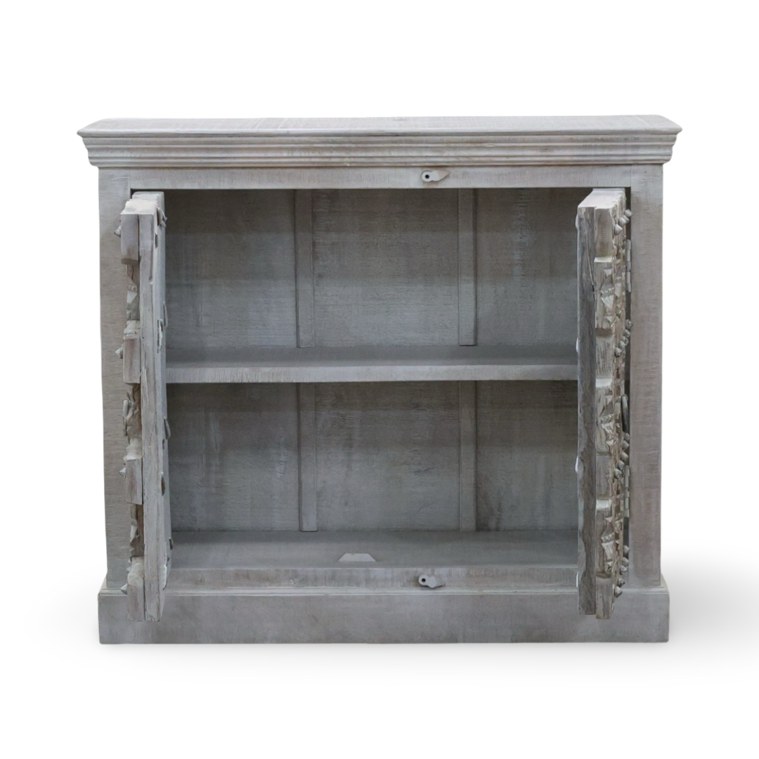 Gabinetes elaborados a mano en la India, fabricados en madera maciza y decorados con tallas y detalles artesanales únicos. Cada pieza combina funcionalidad y carácter, con acabados envejecidos que realzan su belleza natural.