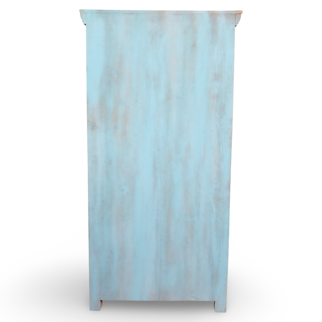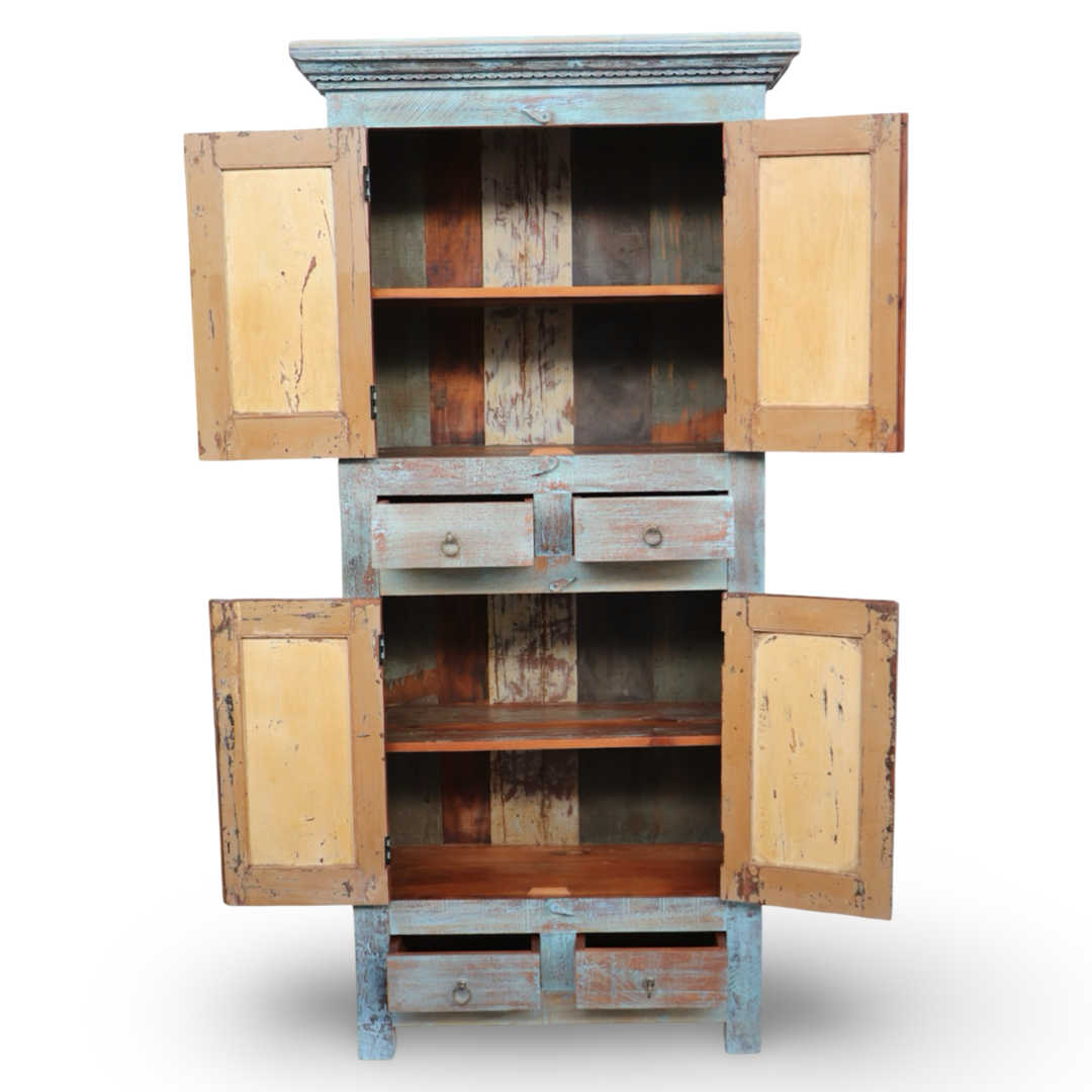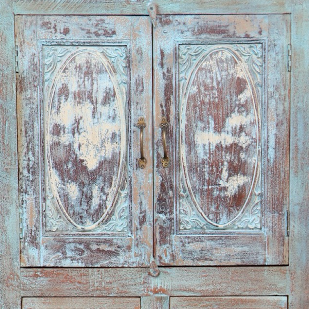 Armarios elaborados a mano en la India, fabricados en madera maciza y decorados con detalles tallados que hacen de cada pieza una obra única. Sus acabados envejecidos aportan carácter, calidez y un estilo atemporal.