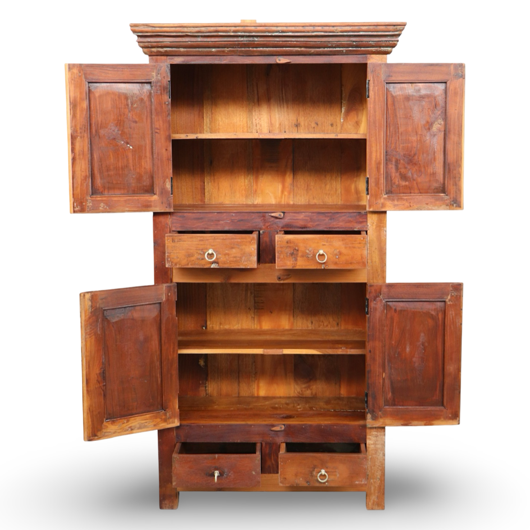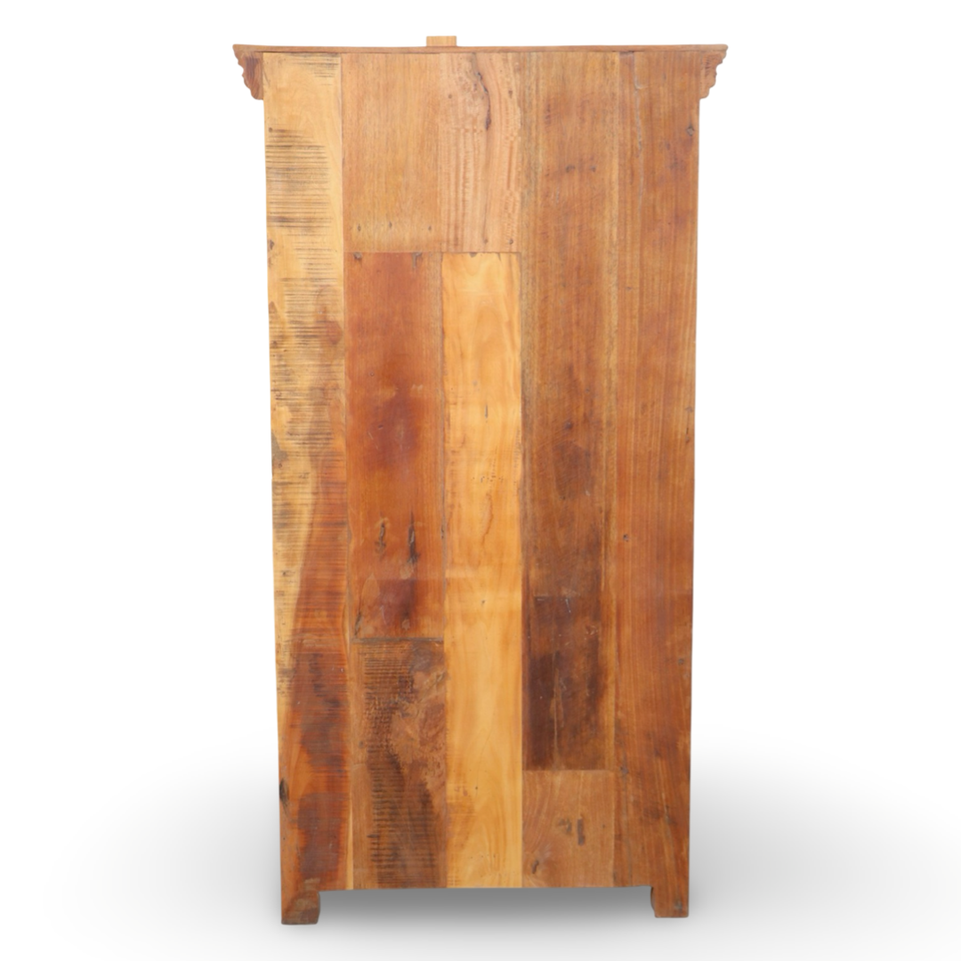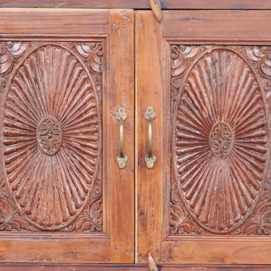 Armarios elaborados a mano en la India, fabricados en madera maciza y decorados con detalles tallados que hacen de cada pieza una obra única. Sus acabados envejecidos aportan carácter, calidez y un estilo atemporal.