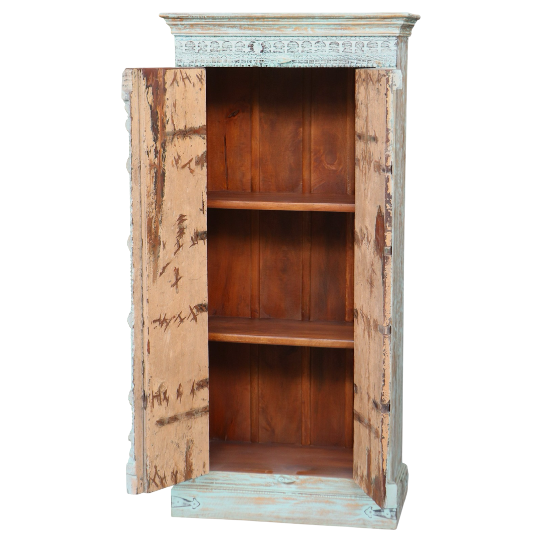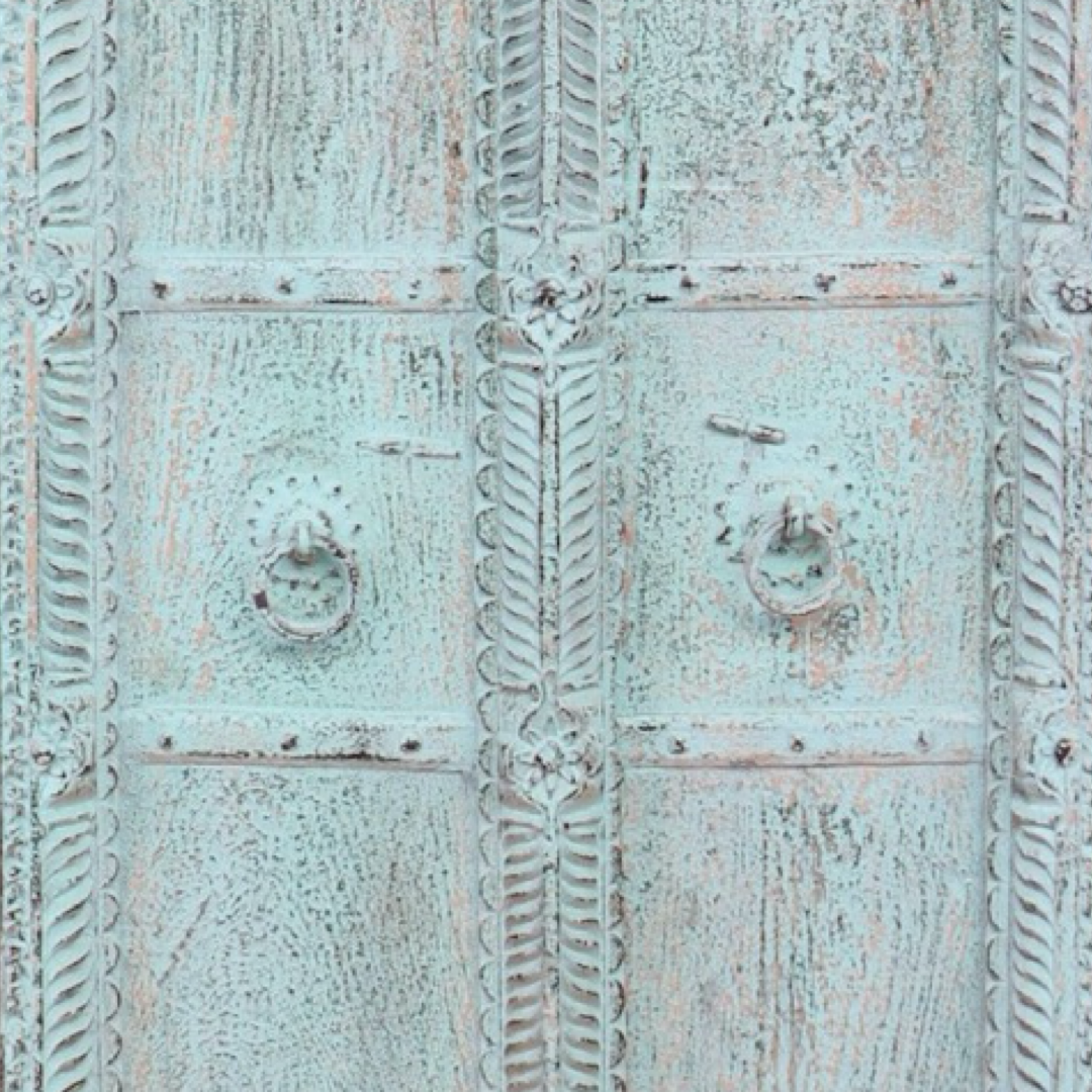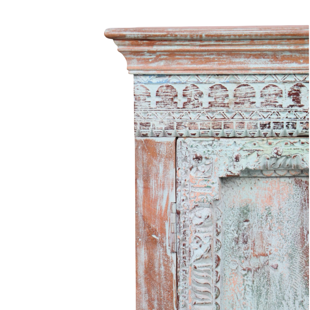 Armarios elaborados a mano en la India, fabricados en madera maciza y decorados con detalles tallados que hacen de cada pieza una obra única. Sus acabados envejecidos aportan carácter, calidez y un estilo atemporal.