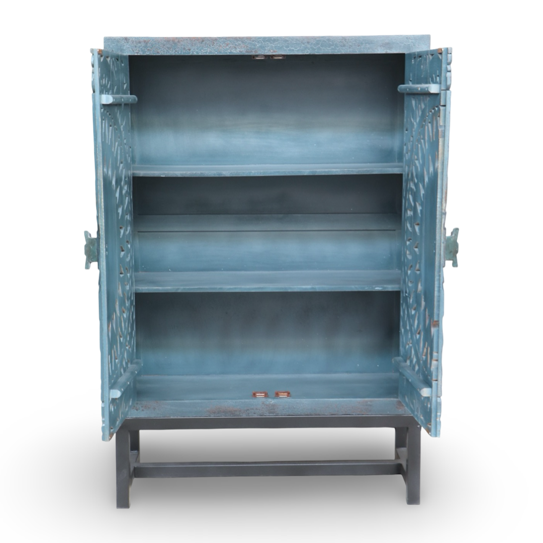 Armarios elaborados a mano en la India, fabricados en madera maciza y decorados con detalles tallados que hacen de cada pieza una obra única. Sus acabados envejecidos aportan carácter, calidez y un estilo atemporal.