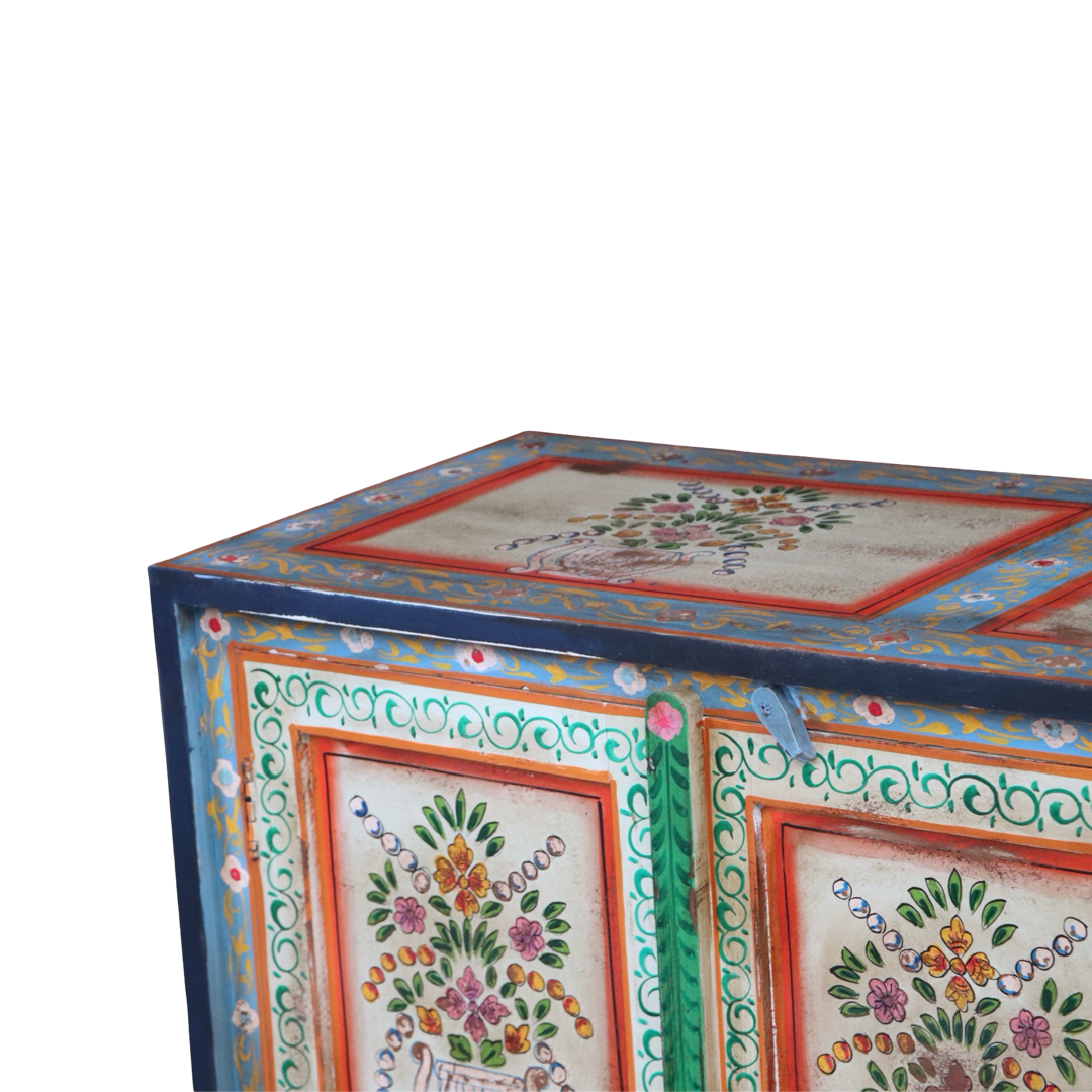 Bifes elaborados a mano en la India, en madera maciza y con tallas artesanales que hacen de cada pieza algo único. Combinan carácter decorativo y funcionalidad, ideales para guardar vajilla, textiles o piezas especiales.