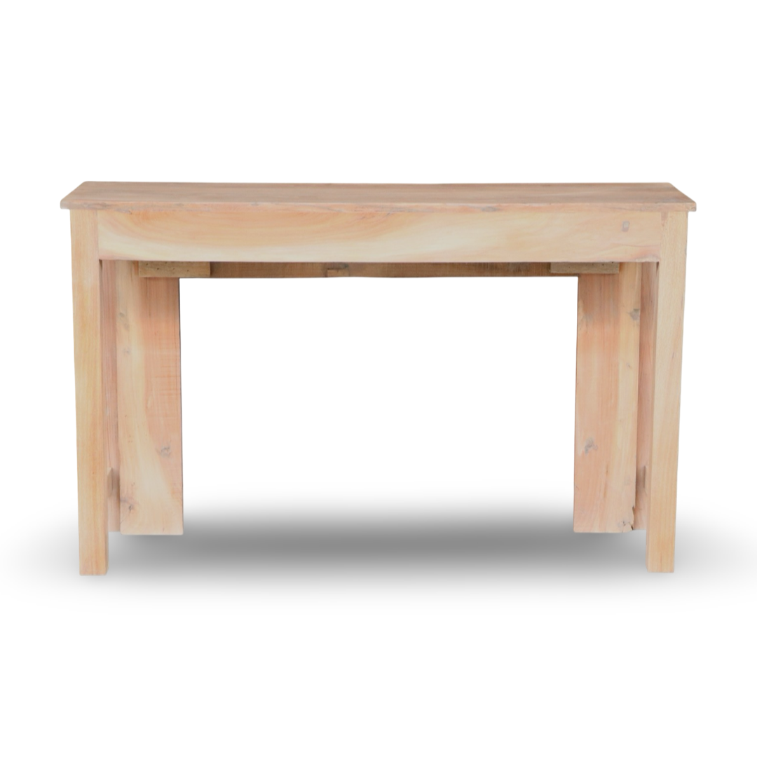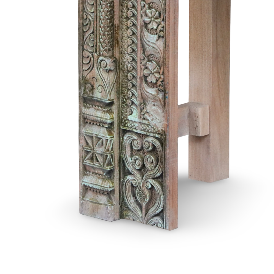 Consolas elaboradas a mano en la India, en madera maciza y con detalles tallados que reflejan el trabajo artesanal tradicional. Cada pieza presenta acabados envejecidos que aportan carácter y calidez.