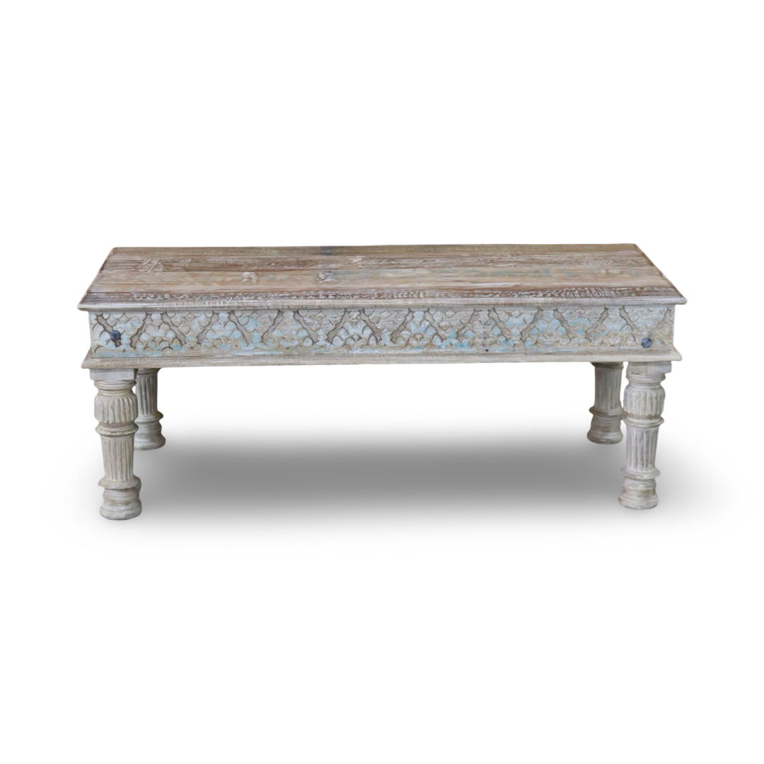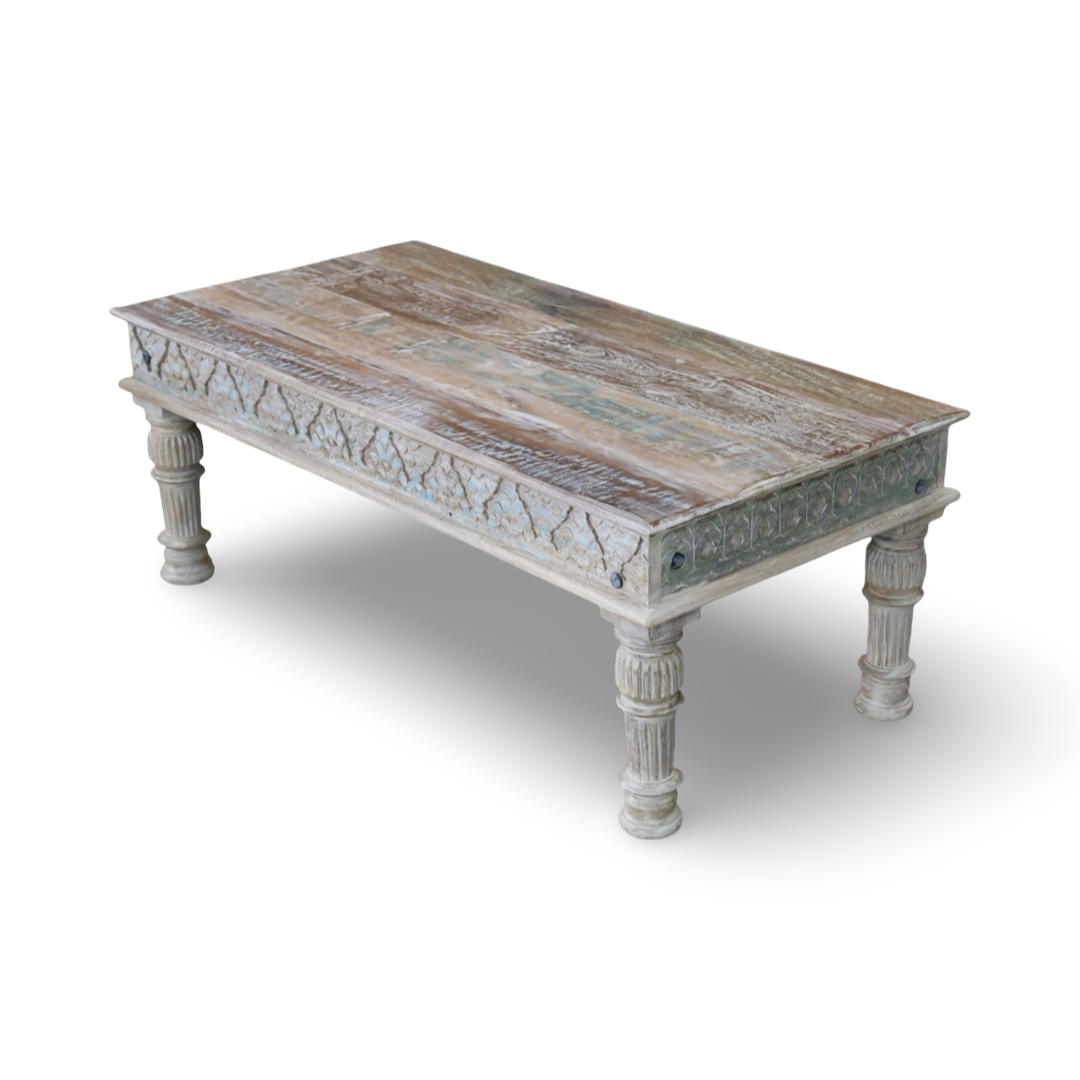 Mesas de centro elaboradas a mano en la India, en madera maciza y con detalles tallados que resaltan el trabajo artesanal. Cada pieza presenta acabados envejecidos que aportan carácter y calidez al espacio.