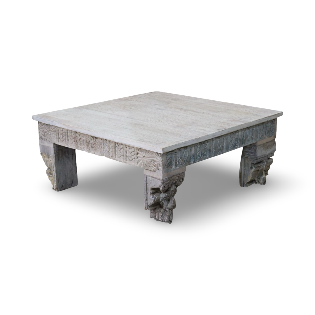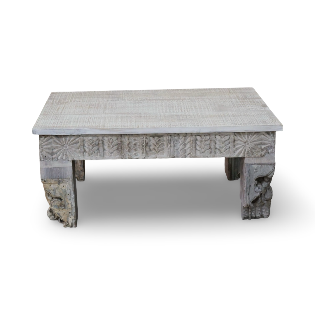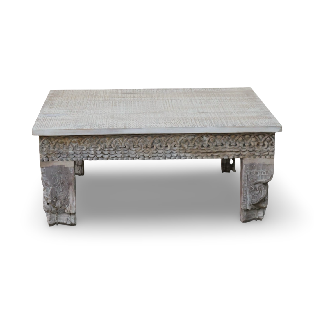 Mesas de centro elaboradas a mano en la India, en madera maciza y con detalles tallados que resaltan el trabajo artesanal. Cada pieza presenta acabados envejecidos que aportan carácter y calidez al espacio.