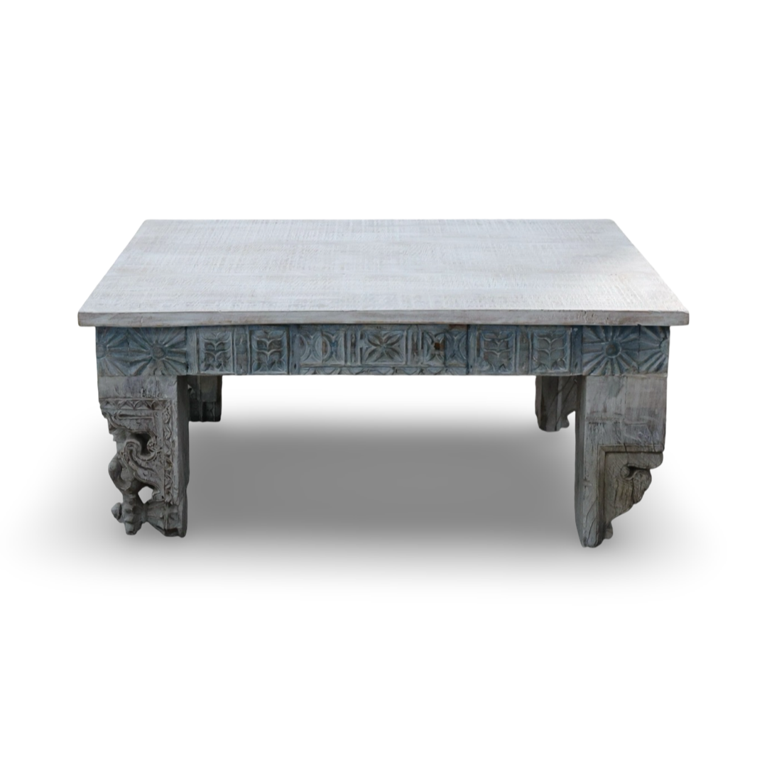 Mesas de centro elaboradas a mano en la India, en madera maciza y con detalles tallados que resaltan el trabajo artesanal. Cada pieza presenta acabados envejecidos que aportan carácter y calidez al espacio.