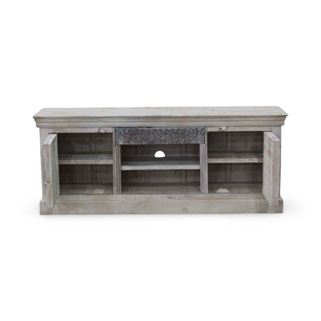 Este stand de TV es una pieza única, elaborada en madera maciza reciclada y tallada a mano por artesanos en la India. Cada mueble conserva el carácter de la madera antigua, con detalles ornamentales que reflejan la tradición y el arte del tallado indio. Más que un soporte funcional, es un elemento decorativo con historia y personalidad, ideal para espacios con alma y estilo.